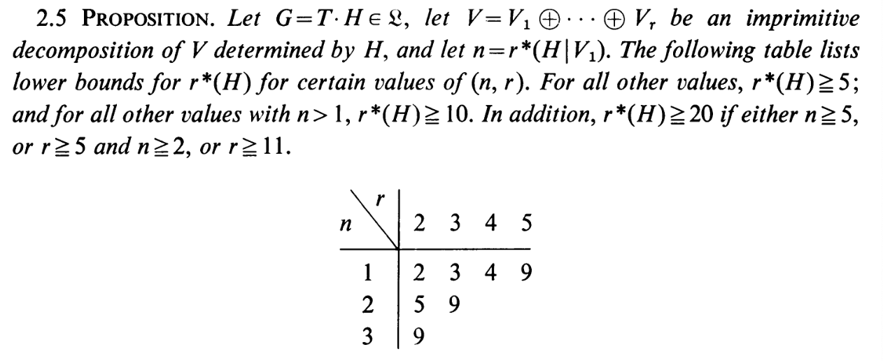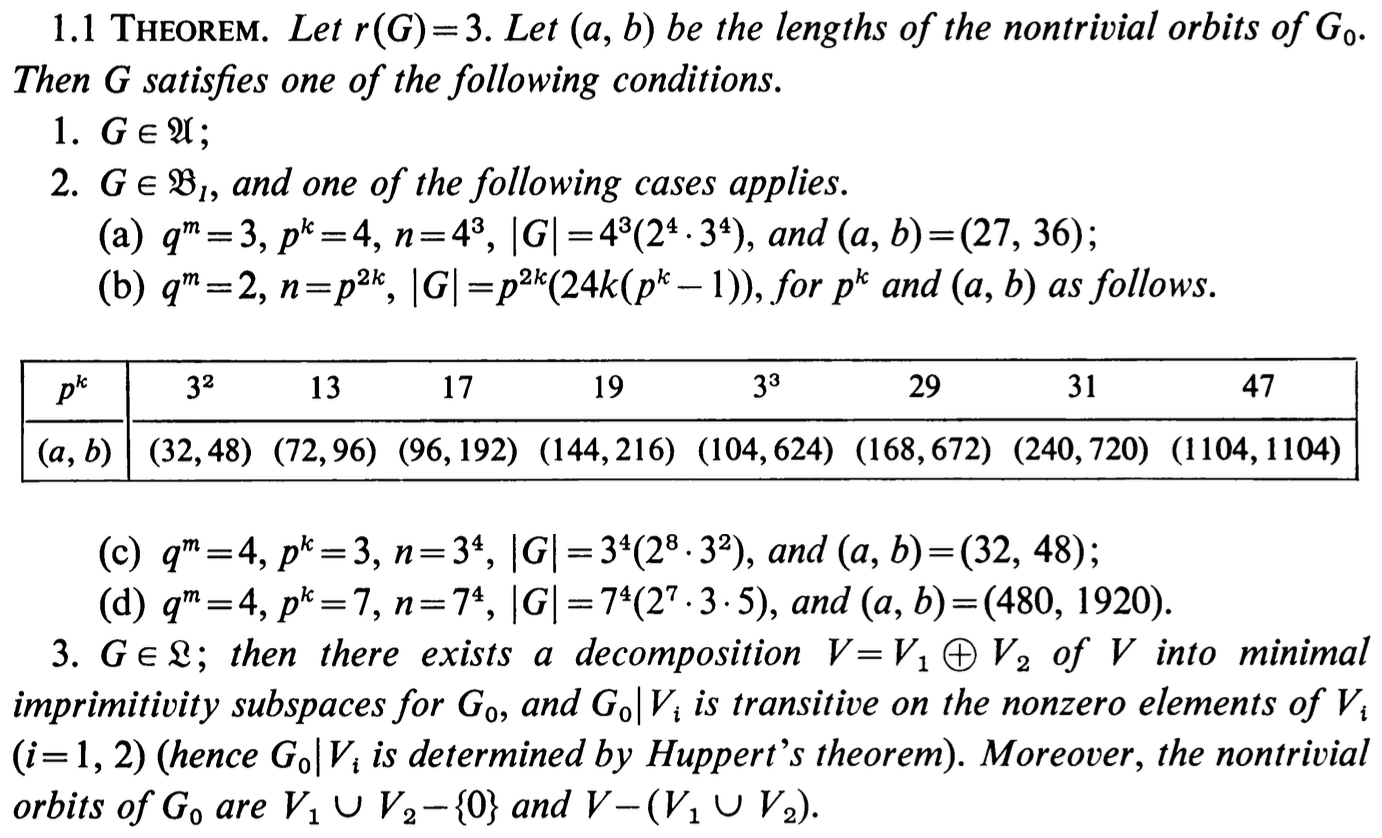 对于一个作用在上的极大可解本原置换群, 的唯一极小正规子群是阶为的elementary abelian群,且正则地作用在上。因此可以看作在向量空间上的作用,, 向量的点稳定子是一个线性群,群的秩就对应于线性群 在 上的轨道数量。