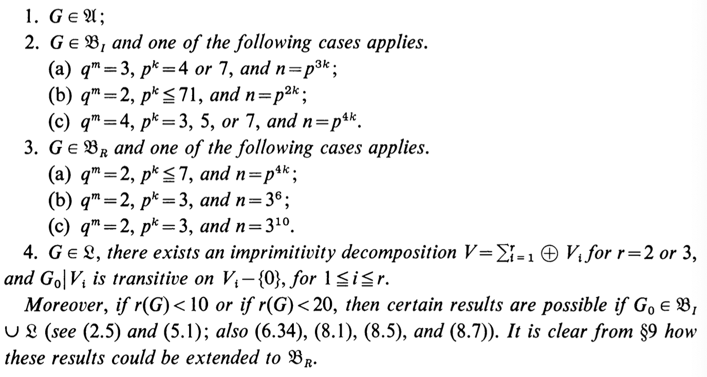 The standard analysis of the class of solvable linear groups divides this class roughly into subclasses, , , and . consists of collineation groups of affine lines; consists of the remaining groups which are vector space primitive, and of those which are imprimitive. It is explained here.