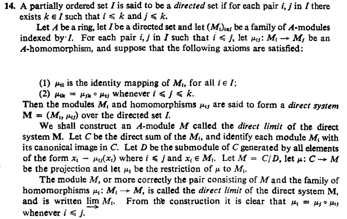 Text-Ex. 2.16. Show that the direct limit is characterized (up to isomorphism) by the following property. Let be an -module and for each let be an module homomorphism such that whenever . Then there exists a unique homomorphism such that for all .