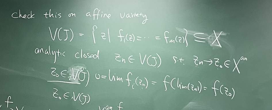"→" Assume that is a variety, then is closed in Zariski topology and is closed in analytic topology. Note that , then is Hausdorff.