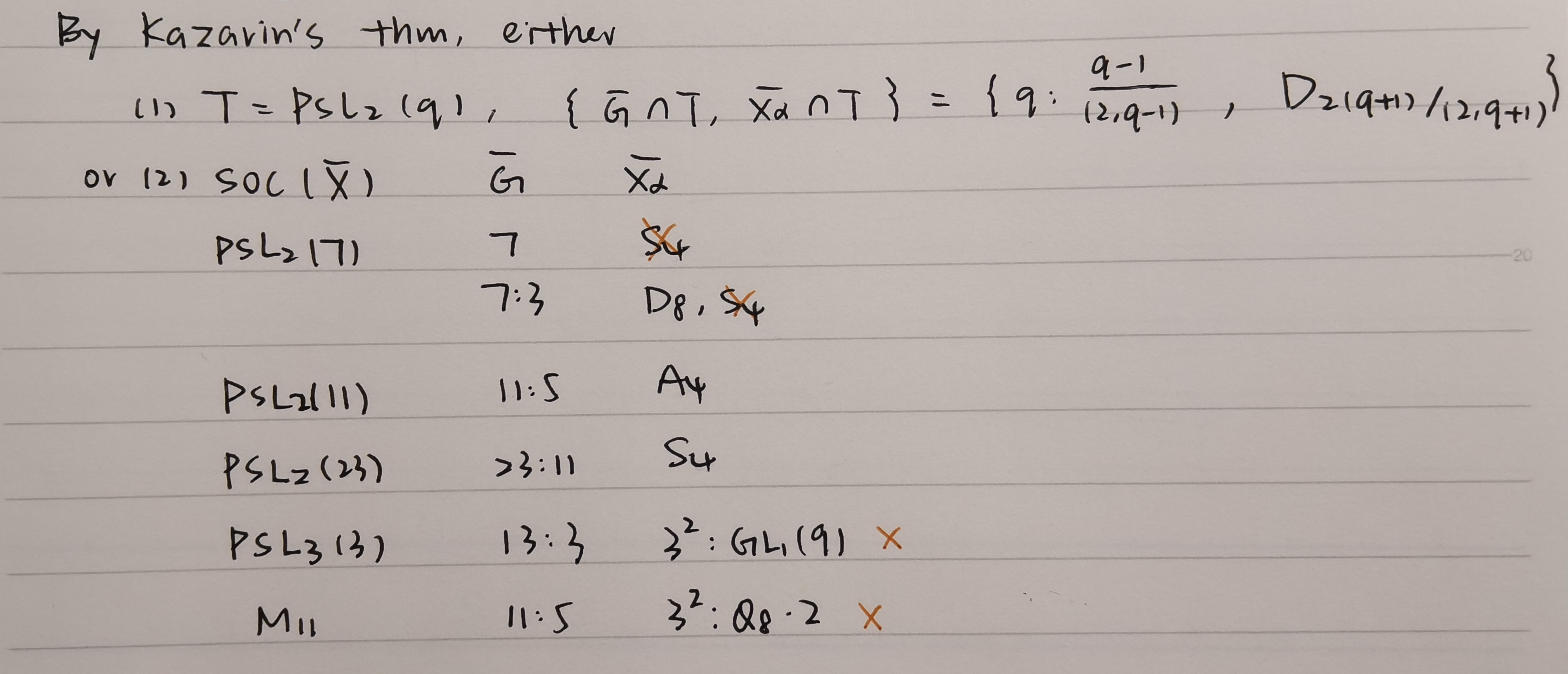 Now we have known that . (i think up to now we only know L is one of groups in the list? 所以Xbar会随之确定?) And where is metacyclic and is the maximal solvable subgroup of .