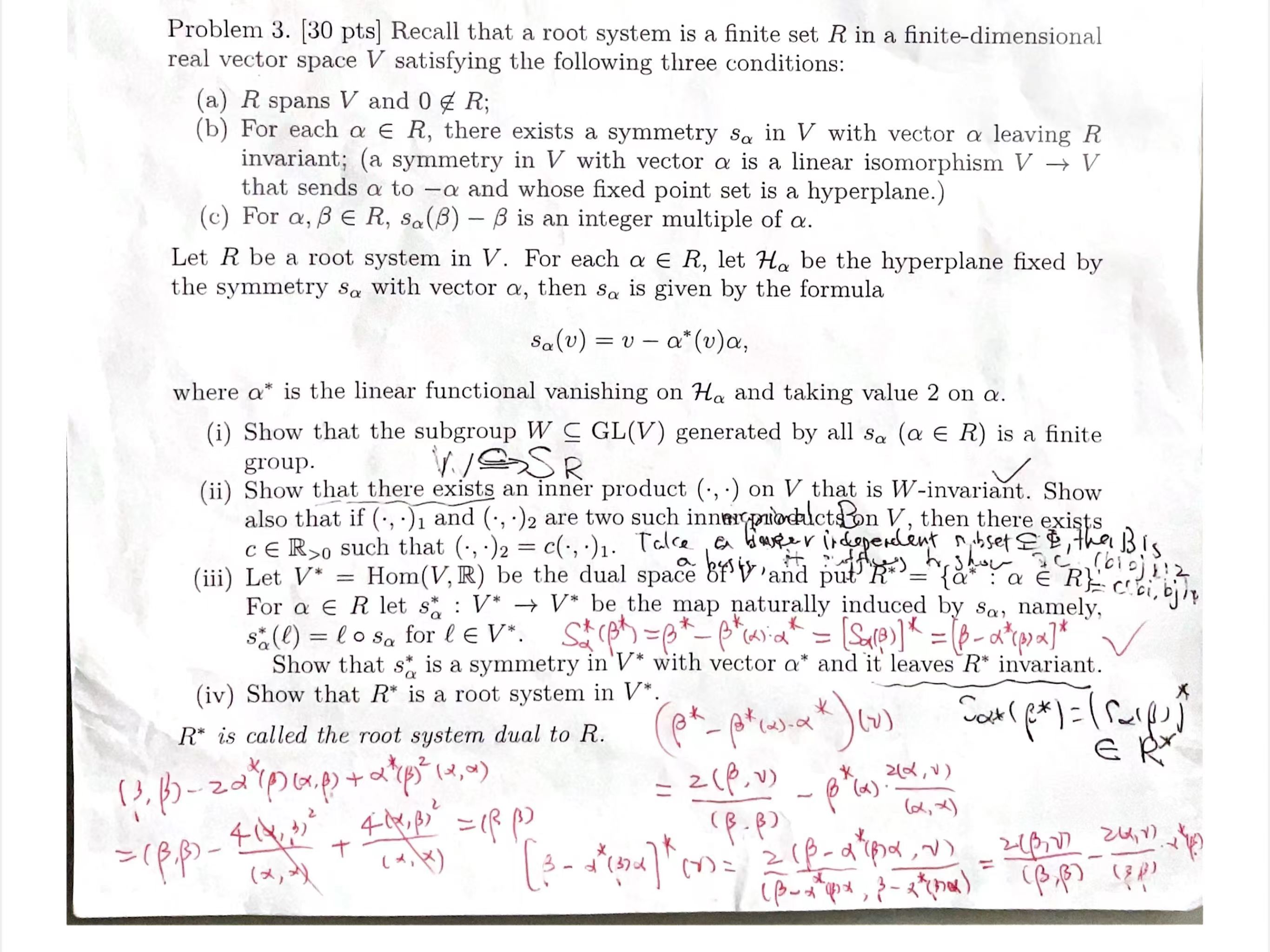 Proof. In 4.3 Root system, we have proved that is a root system with “dual inner product”, i.e. it is a root system according to Definition 1. Since Definition 1 and Definition 1’ are equivalent, is also a root system according to Definition 1’ and it is done. However, I want to prove it with inner product omitted.