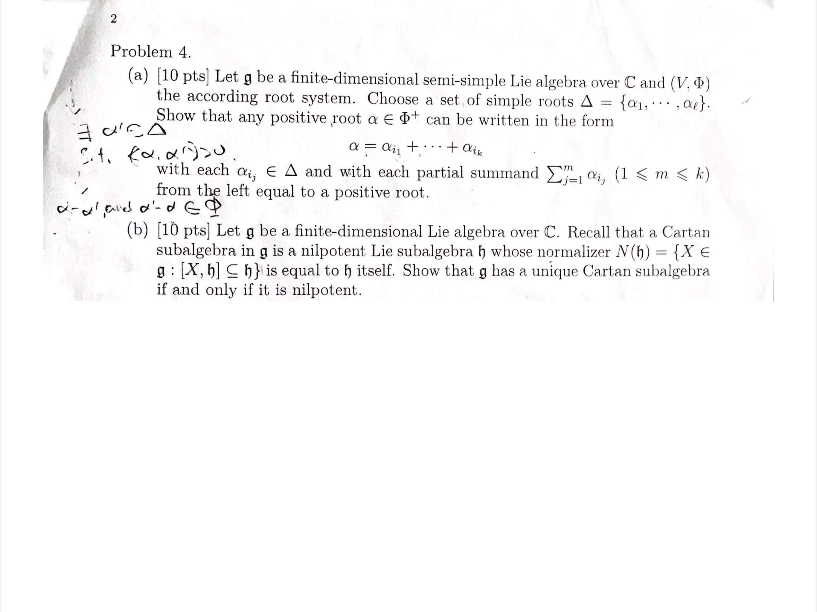 Q4. Let be a finite dimensional semi-simple Lie algebra over and the according root system. Choose a set of simple roots . Show that any positive root can be written in the form