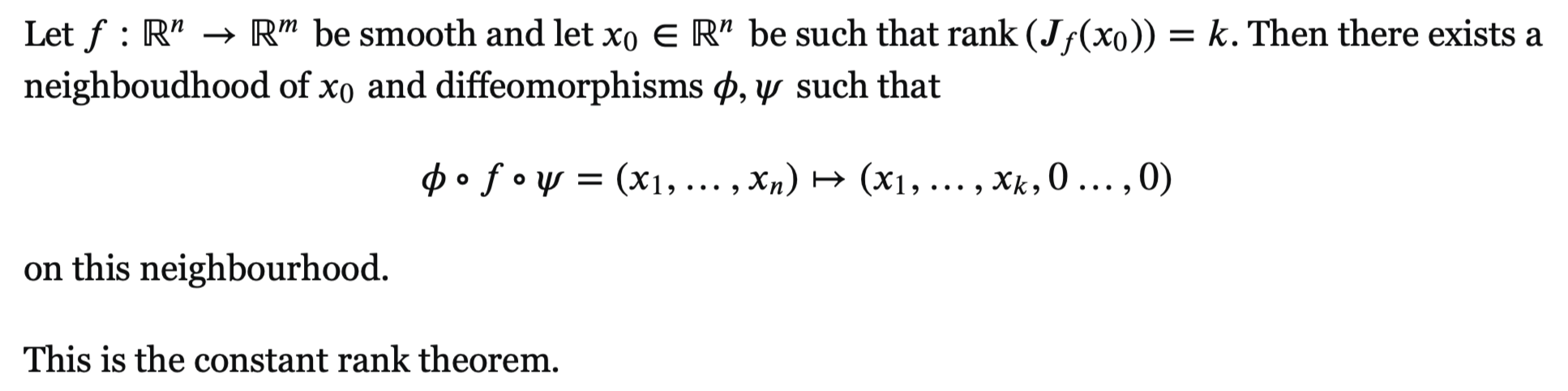 Thm. (regular level set theorem) Let be a smooth map between manifolds of dimension and respectively. A non-empty regular level set where is a sub-manifold of of dimension equal to .