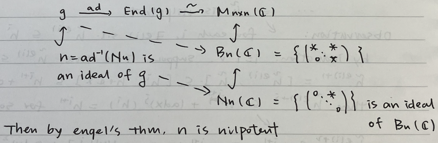 ii) Suppose is nilpotent. Then is solvable and there is a basis s.t. is upper triangular for all . By Engel’s theorem, is nilpotent. By Cayley-Hamilton is strictly upper triangular matrix.