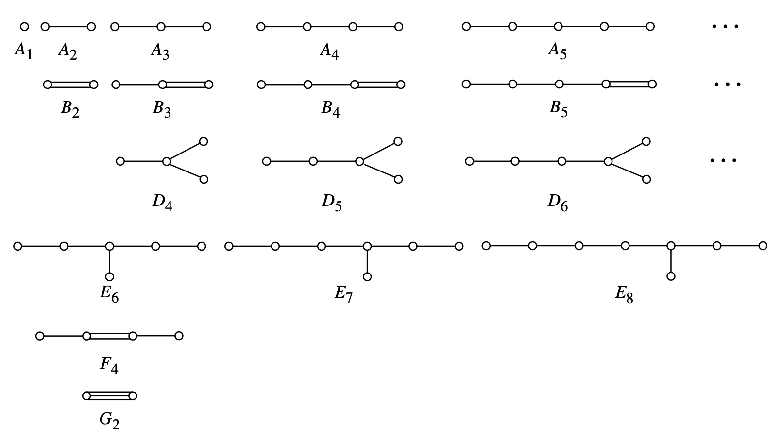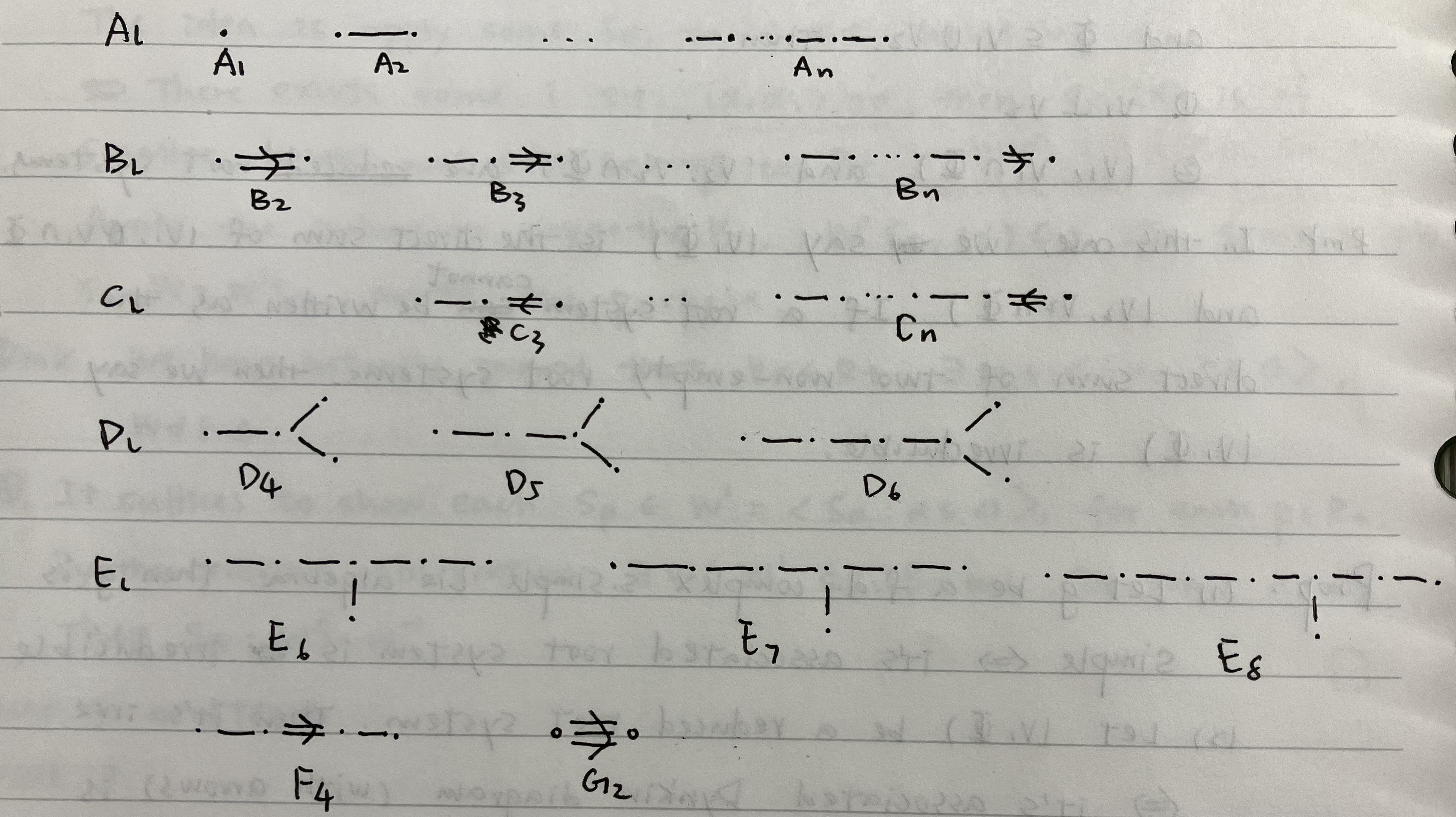 and so define its Dynkin diagram. Note that any root system is uniquely determined by a Cartan matrix up to scalar. Furthermore, we can prove that there is a 1-1 correspondence between finite dimensional complex simple Lie algebras and Dynkin diagrams.