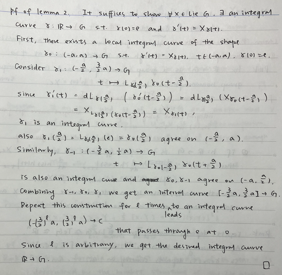 \begin{proof} Firstly, we need to show . Since both of them are integral curves going through at , they agree on by previous lemma. To show the uniqueness, suppose is a smooth group homomorphism with . Then \begin{align}