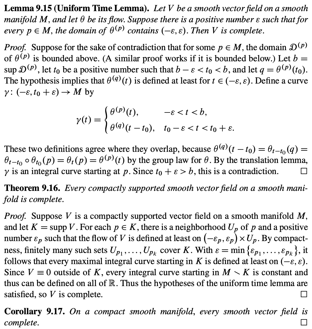A vector field is said to be complete if on a manifold , for any there exists an integral curve such that .