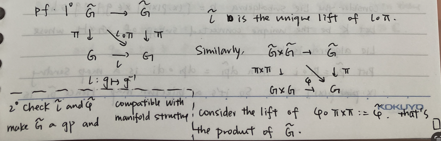 \begin{proof}By the theorem of existence of the universal covering space, has a universal covering . And by the lifting criterion, define multiplication and inverse operations on . By the uniqueness of lifting, these operations do make a group. And the preimage of projection map gives charts of . Thus is a Lie group. Also is smooth because on every chart the map equals identity. The notes on the class is attached here.