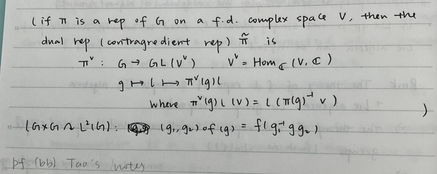 L^2(G)=\oplus_{\pi\in\hat G}\pi\times\pi^{\vee} $$where .
