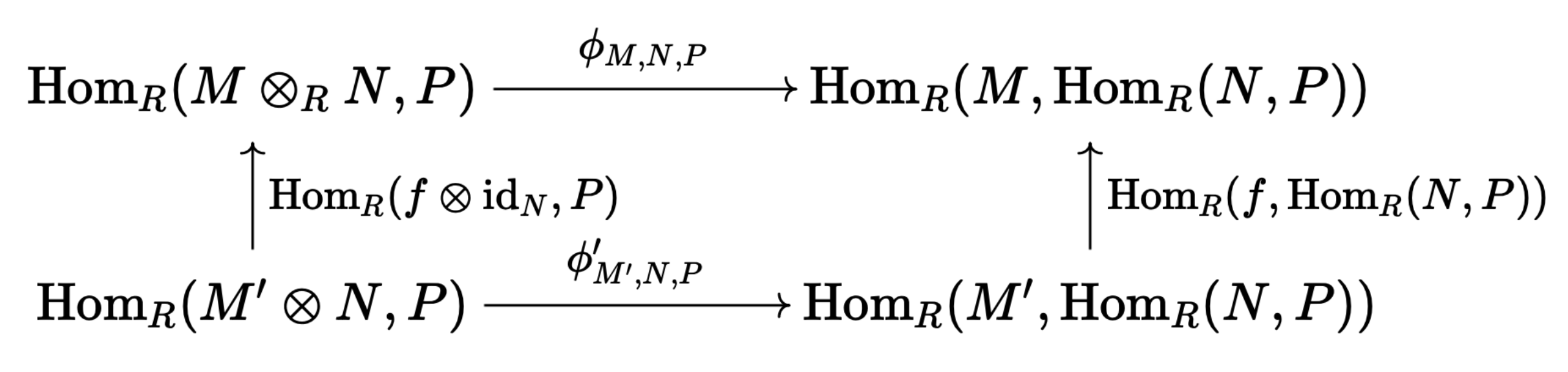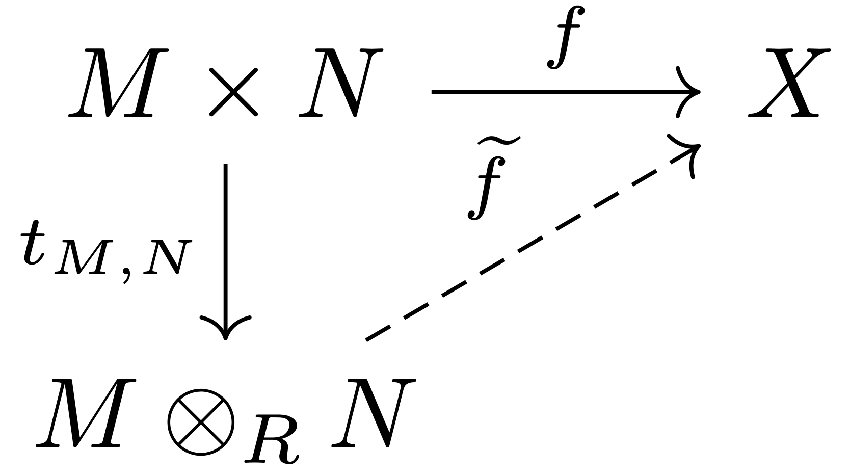 Let and be -module. The tensor product of and is pair where is an -module and is a bilinear map, usually denoted which satisfies the following universal properties: whenever is a -module and is a bilinear map, there exists a unique -morphism such that the following diagram commutes